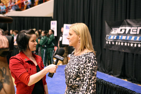 Former Michigan gymnast Elise Ray interviews Wolverines coach Bev Plocki at this year's NCAA championships. Ray works occasionally as a analyst for the Big Ten Network. (Photo courtesy of the University of Michigan.)