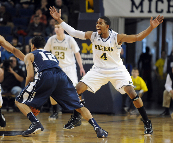 Michigan's Darius Morris (4) had his hands with Penn State guard Talor Battle (12), who scored a game-high 31 points in Michigan's 76-69 win Sunday at Crisler Arena. Morris led Michigan with 20 points.