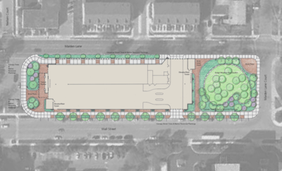Architects plan to plant trees along the lengths of the structure lining Maiden Lane and Wall Street. At the east end of the property architects will plant a sedge wetland meadow.