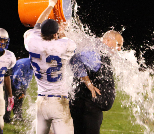 Lincoln coach Chris Westfall is drenched by Ryan Yeager after Lincoln defeated Ypsilanti, 27-12, to secure the first playoff berth in school history.