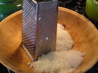 3. Grab the cheese from the fridge and start to grate on the smallest setting. (Swiss cheese will want to squish back together when grated; try to avoid this by avoiding too high a pile of cheese. Rather, go wide.)
