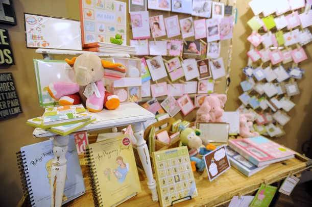 The store carries a mix of products, from wine glasses with a chalkboard base to aprons, picture frames, personalized stationery and wedding invitations.