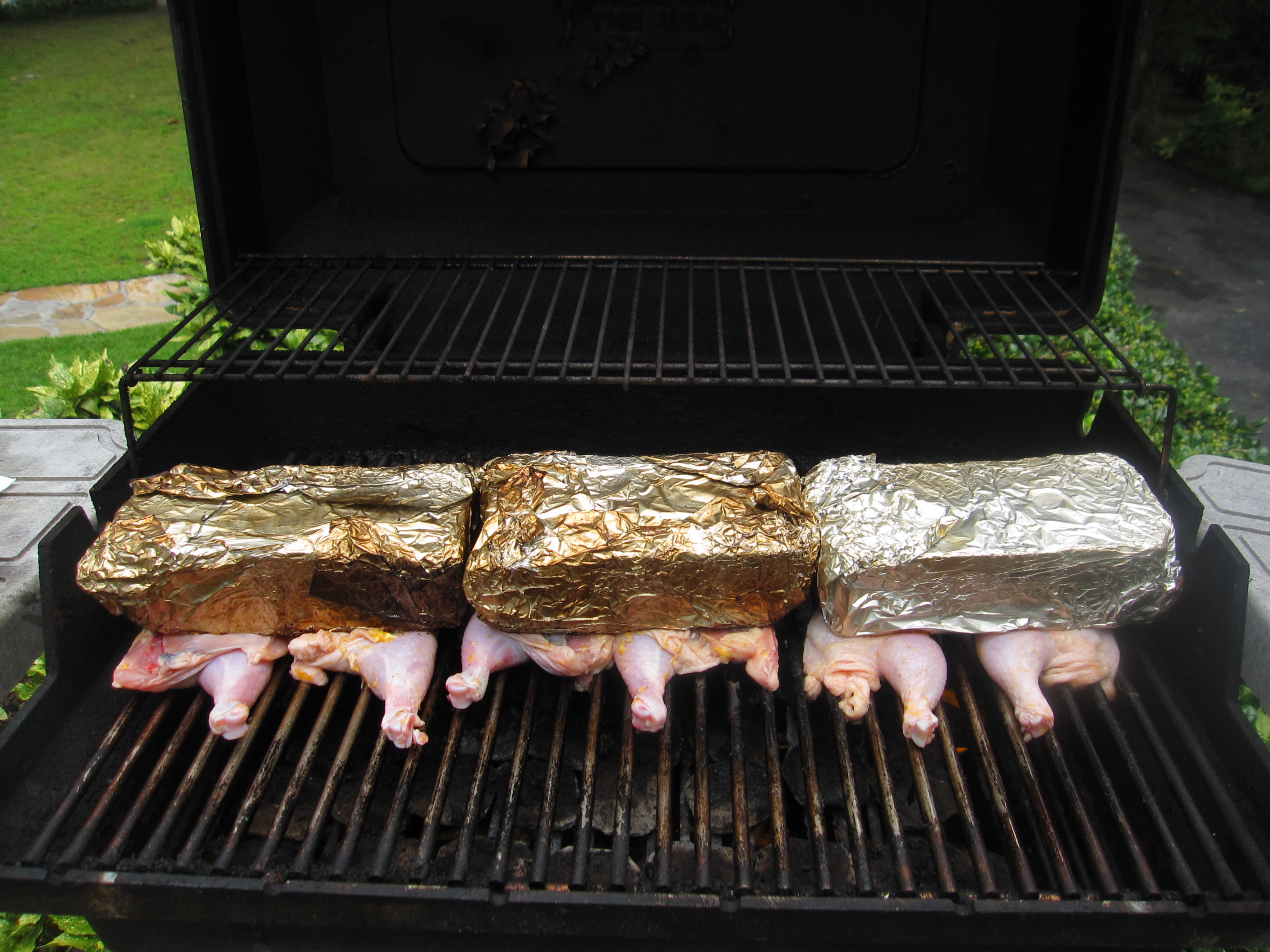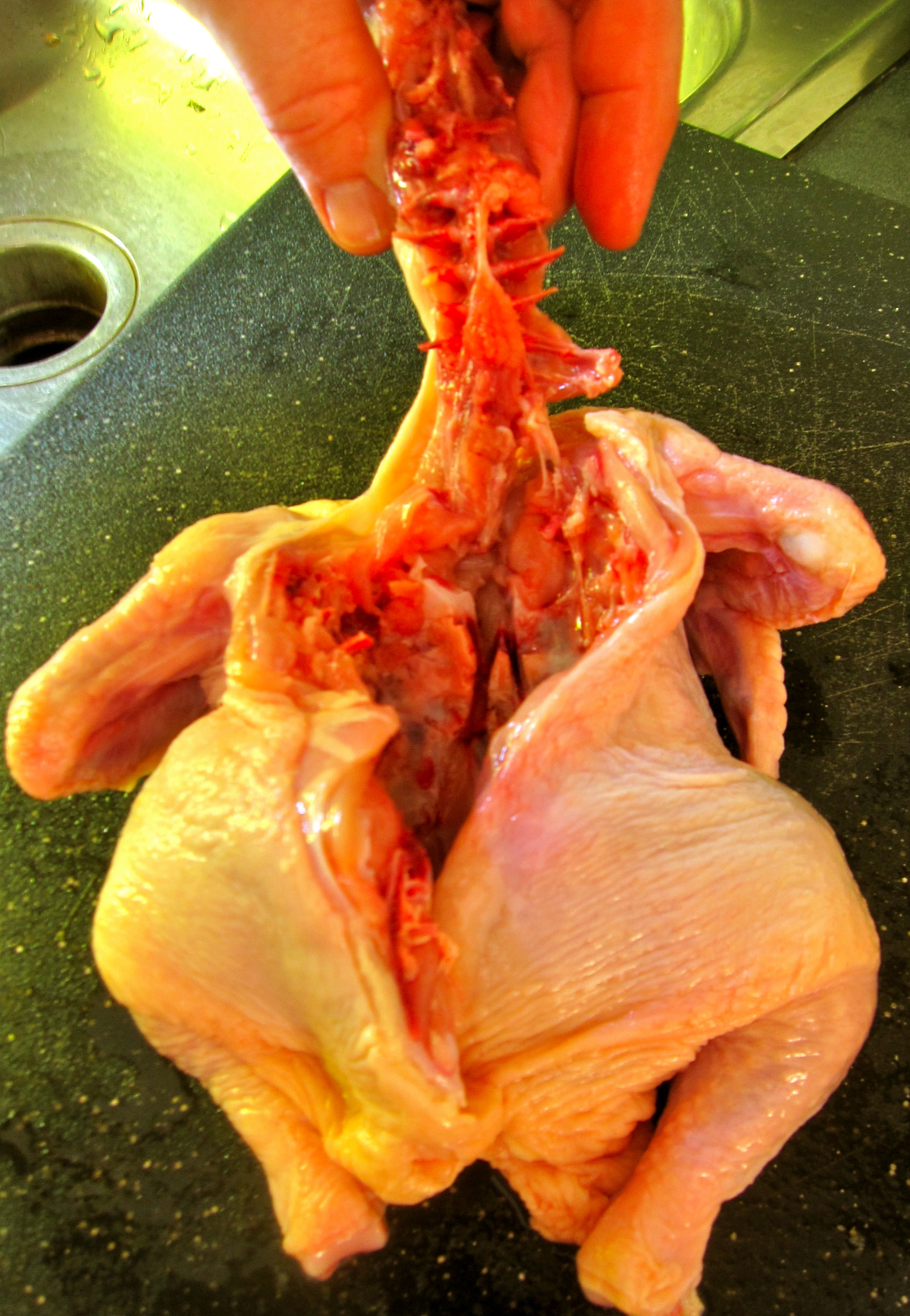 There is nothing quite like the crisp, crackling, golden brown skin and moist, juicy breast and thigh meat that grilling under a hot brick offers. Though the technique has enjoyed popularity of late in American kitchens, Italian families, especially in Tuscany, have been cooking what they call pollo al mattone for centuries.The most important technique for grilling any type of poultry under bricks is spatchcocking the bird. Spatchcocking is Irish terminology for removing the game hen's backbone (or butterflying) so the bird will cook evenly. For additional information on this technique, click the spatchcock link for a tutorial using whole chicken; I used the same technique for the Cornish game hens. The tutorial uses kitchen shears but I found a sharp knife works just as well.