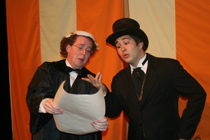 David Andrews, the sorcerer of the title, played his role as if he were born to it. His entrance marked the point where the production really took off. The G&S veteran was pitch-perfect in the patter song “My name is John Wellington Wells,” and he seemed to delight in the devilish mischief his character was causing (the red gloves were a perfect touch). “Incantation” was also compelling, and it was there Andrews got to savor some of the show’s tastier wordplay (“Now shriveled hags, with poison bags, Discharge your loathsome loads! Spit flame and fire, unholy choir! Belch forth your venom, toads!”). Jeff Wilkinson was also first rate as the young newlywed Alexis, the one who sets the love potion in motion. He has a beautiful voice that was a delight to hear, particularly during his second-act ballad. As Constance, soprano Alexandra Kahn also delivered the goods; the scene in which she is alternately attracted to, then repelled from, the old geezer the potion makes her fall for is great comedy. It’s hard to believe she is not a music major. Sara Zeglevski (Aline), Jesse Murillo (Sir Marmaduke Pointdextre), Matt Peckham (Dr. Daly) and Diana Herstein (Mrs. Partlet) were also uniformly strong.