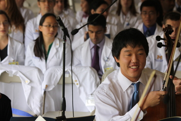 Some students volunteered to guide cars into the park’s Garden of Memories, while others handed out carnations at the reception tent. In the main tent, a student quintet played Mozart before the service, which began with a greeting from program director Thomas Gest. A 20-member student chorus sang “Amazing Grace” before brief talks by four current students and a powerful speech by Dr. Karen Fauman, a 2004 U-M medical school graduate.