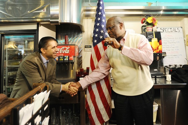 Big Sky Diner owner Tony Metko shakes hands with Republican presidential candidate Herman Cain during a campaign stop in Ypsilanti on Thursday morning. Melanie Maxwell I AnnArbor.com