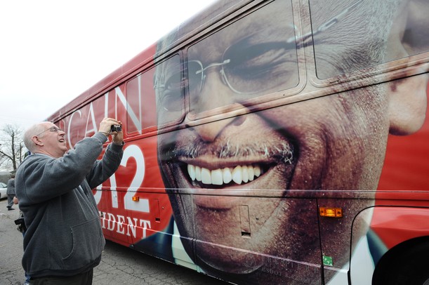 A supporter grabs a photo of Republican presidential candidate Herman Cain's tour bus as it leaves a stop at the Big Sky Diner in Ypsilanti on Thursday morning. Melanie Maxwell I AnnArbor.com