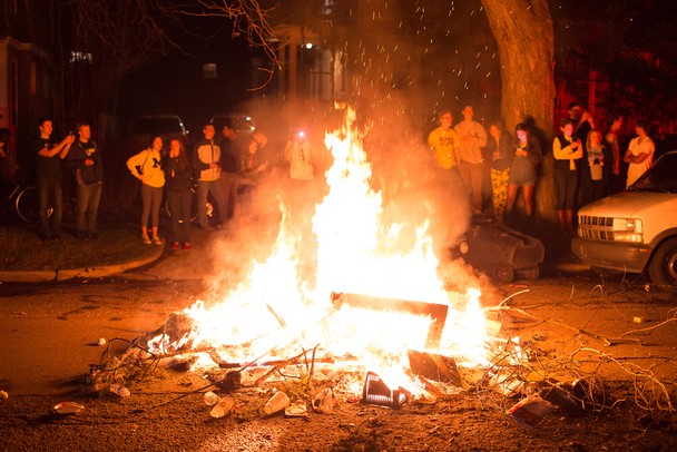 University of Michigan fans watch as debris burns in the middle of White Street in Ann Arbor after the Wolverines' loss to Louisville. Courtney Sacco I AnnArbor.com /calendar/photologue/photos/_1_/cache/040813_UM_NCAA_fires_CS-2_fullsize.JPG