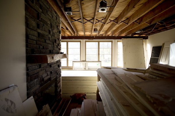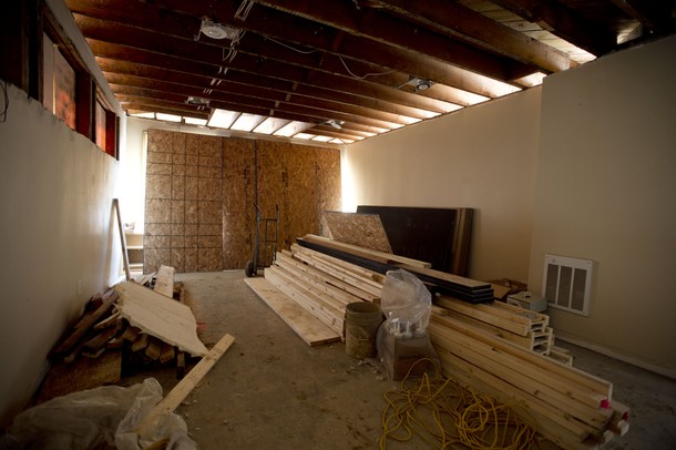 Materials are stacked in the living room as construction continues on Paul Hickman's mid-century house on the west side of Ann Arbor. Melanie Maxwell I AnnArbor.com