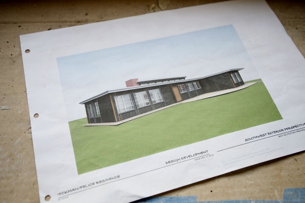 With architect Michael Klement, principal of Architectural Resources, and Doug Selby, owner of Meadowlark Building, Hickman is building an environmentally friendly house that uses old hemlock barn wood from a Michigan farm for the exterior siding, the old vinyl siding for the garage and the wormy wood from a distressed maple tree next to the house for the floors and trim.