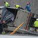Rescue crews work to secure chains to a turned over trailer as they prepare to lift it upright using two tow trucks. The trailer flipped onto its side, spilling part of its load and pinning another vehicle against the guardrails on south U.S. 23 north of Six Mile Road in Northfield Township on Monday, March 11, 2013. Melanie Maxwell I AnnArbor.com