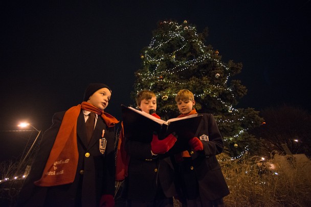 The crowd listens to three members of the Boychoir of Ann Arbor sing christmas carols after the tree lighting ceremony in Ypsilanti's Depot Town Saturday night.