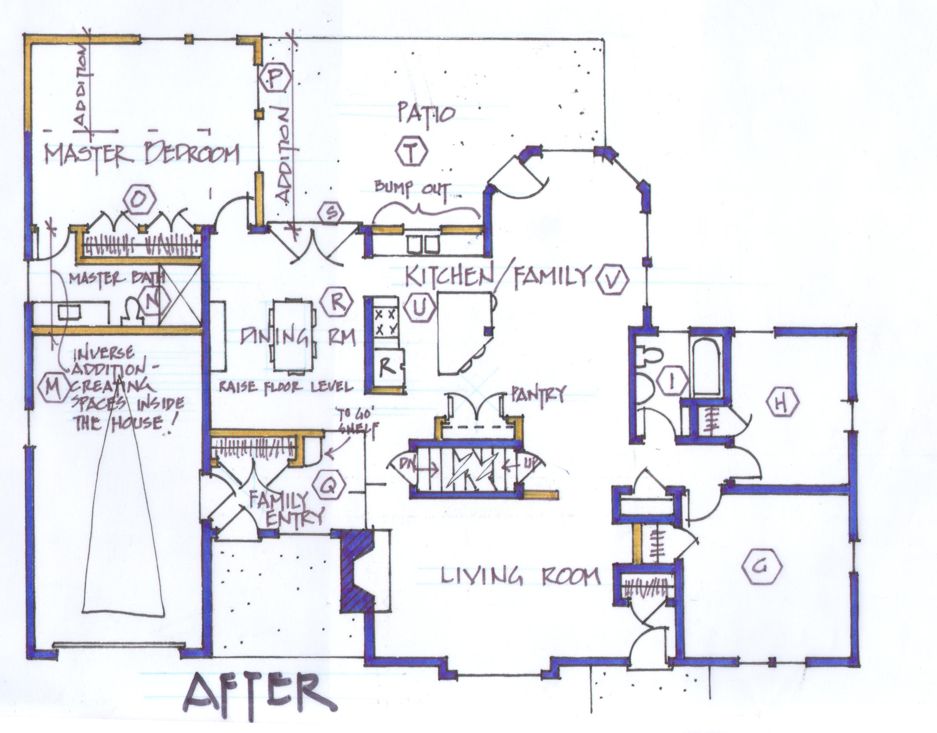 The plan was to leave the bedrooms (G&H) and hall bath (I) alone and create a new, up to date master bedroom elsewhere. An addition was needed for this, but we added less square footage when we made an “inverse addition”(M) - creating spaces out of existing structure. A master bathroom (N) and closets (O) nestle neatly in the back of the garage. The actual addition (P) is for the master bedroom, utilizing a door that was in the family room (L). We took the front part of the family room (another inverse addition) to create a proper family entry (Q), complete with a closet and “To Go” shelf. The remainder of the family room became a formal dining room (R) - a room with way less traffic. New French doors (S) lead out to a new, large patio (T). The kitchen (D) was expanded out with a bump out, since we didn’t want to change the stairways (C). Now we have room for a kitchen island and a closet style pantry. We removed two walls of the former dining room (F) to make the whole space an open kitchen/family room (V). Marcia Lyon is a professional remodeling designer and freelance writer, producing projects in Ann Arbor, Metro Detroit and several other areas across the United States and Canada. Her new E-book on remodeling design is available on her web site www.creatingspaces.net. Reach her at Marcia@creatingspaces.net or at 515-991-8880.