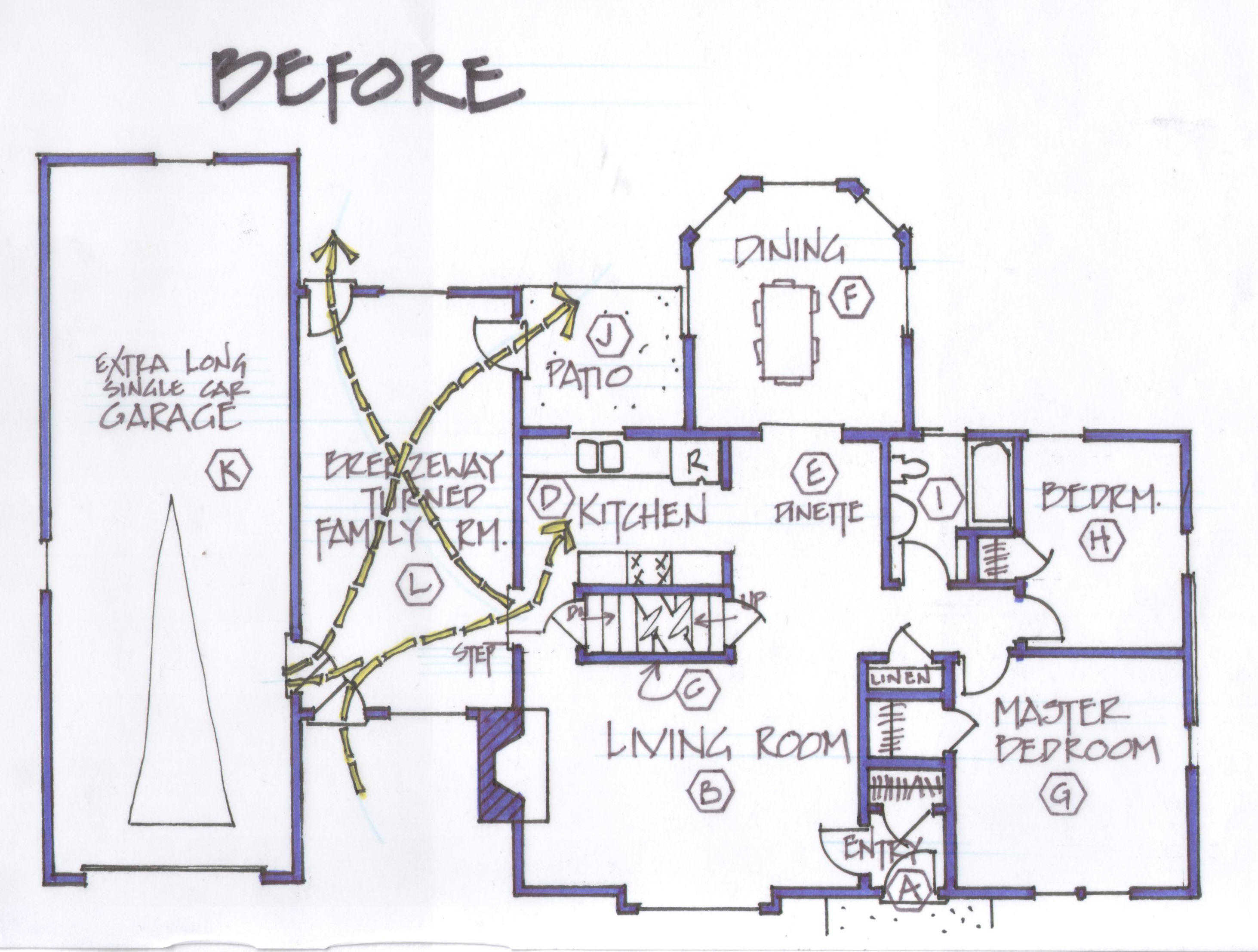 The original house was quite small. The front entry (A) was a confined air lock entry leading to the living room (B). The stair (C) up and down is centered between the kitchen (D) and living room. The small dinette (E) became simply a wide hallway when the dining room addition (F) was built.The bedrooms (G & H) were minimal with minimal closets. A single hall bath (I) had to serve the entire house. The homeowners’ main desire was to enlarge the master bedroom, add closets and a second bathroom. Outdoor living was an afterthought on the postage stamp concrete patio (J). The long, narrow garage (K) and breezeway/turned family room (L) clearly didn’t work. This family needed a family entry and less disjointed living spaces. SOLUTION