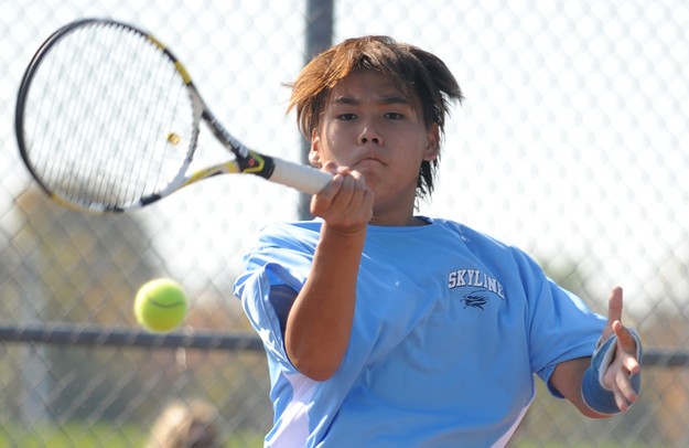 Skyline's Kazuki Mutsuro hits the ball during a 1st doubles match against Canton at the tennis regionals at Pioneer High School on Oct. 7, 2011. Angela J. Cesere | AnnArbor.com /calendar/photologue/photos/!tennis/cache/100711-AJC-SPT-tennis-regionals-at-Pioneer-01_fullsize.JPG