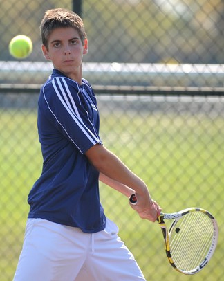 Saline's Spencer Kennedy competes in the 1st doubles semi-finals against Pioneer during tennis regionals at Pioneer High School on Oct. 7, 2011. Angela J. Cesere | AnnArbor.com /calendar/photologue/photos/!tennis/cache/100711-AJC-SPT-tennis-regionals-at-Pioneer-06_fullsize.JPG