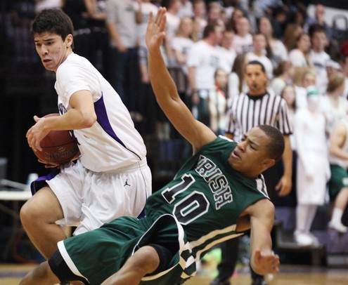 Pioneer captain Gabe Isa(left) and Kamari Davis collide during a play as Ann Arbor Pioneer took on Father Gabriel Richard Tuesday December 6, 2011 at Pioneer High School. Pioneer won the game 70-34. Jeff Sainlar I AnnArbor.com /calendar/photologue/photos/resized/cache/120611_PIONEER_FR.GABRIEL_BBALL_JNS_09_fullsize.JPG