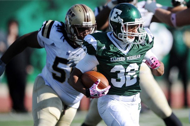 Eastern Michigan sophomore JaDonald Scott looks to tackle Western Michigan sophomore Brian Fields during the first half against Western Michigan at Rynearson Stadium on Saturday afternoon. Melanie Maxwell I AnnArbor.com