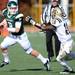 Western Michigan sophomore Tevin Drake attempts to out run Eastern Michigan sophomore Colin Weingrad during the first quarter against Western Michigan at Rynearson Stadium on Saturday afternoon. Melanie Maxwell I AnnArbor.com
