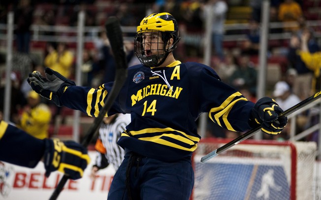 Michigan senior center A.J. Treais celebrates scoring in the game against Miami on Saturday, March 23. Daniel Brenner I AnnArbor.com /calendar/photologue/photos/_UM Beats Miami Hockey/cache/03212013_SPT_UM_Miami_Hockey_DJB_0553_fullsize.JPG