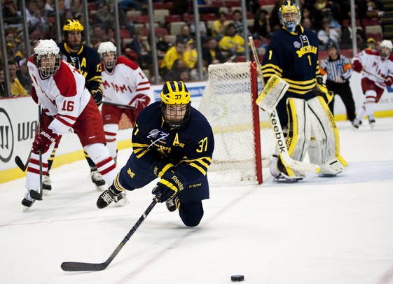 Michigan freshman right wingman Andrew Copp tracks down a puck in the game against Miami on Saturday, March 23. Daniel Brenner I AnnArbor.com /calendar/photologue/photos/_UM Beats Miami Hockey/cache/03212013_SPT_UM_Miami_Hockey_DJB_0640_fullsize.JPG