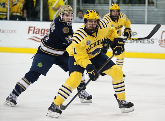 Michigan senior center A.J. Treais moves the puck up the ice in the game against Notre Dame on Friday. Daniel Brenner I AnnArbor.com /calendar/photologue/photos/_UM Notre Dame Hockey/cache/11162012_SPT_UM_NotreDame_Hockey_DJB_0220_fullsize.JPG