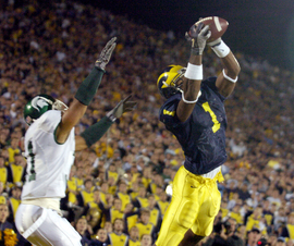 Michigan wide receiver Braylon Edwards (1) makes one of his three touchdown receptions during the Wolverines' 45-37 triple-overtime victory in 2004. Ann Arbor News file photo![]()
