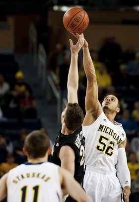 Michigan junior Jordan Morgan contests for the jump ball at the start of the game against Western Michigan on Tuesday. Daniel Brenner I AnnArbor.com /calendar/photologue/photos/_UM Defeats Western/cache/12042012_SPT_UM_Western_BBall_DJB_0219_fullsize.JPG