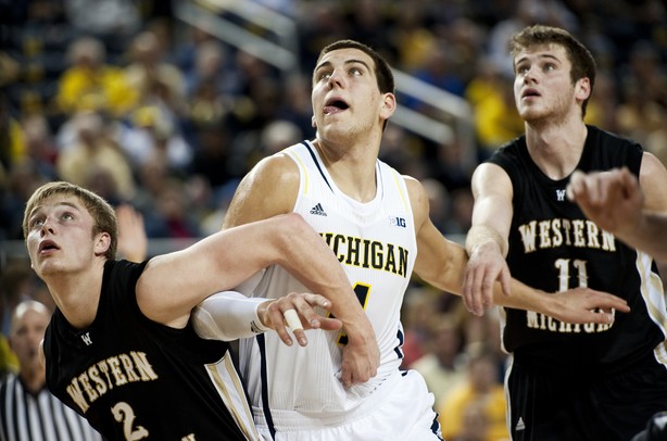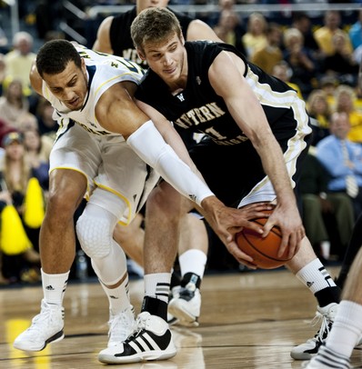Michigan junior Jordan Morgan competes for possession of ball against Western Michigan senior Nate Hutcheson on Tuesday. Daniel Brenner I AnnArbor.com /calendar/photologue/photos/_UM Defeats Western/cache/12042012_SPT_UM_Western_BBall_DJB_0243_fullsize.JPG