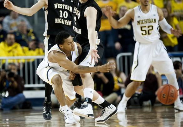 Michigan freshman Nik Stauskas tries to control the ball in the game against Western Michigan on Tuesday. Daniel Brenner I AnnArbor.com /calendar/photologue/photos/_UM Defeats Western/cache/12042012_SPT_UM_Western_BBall_DJB_0655_fullsize.JPG