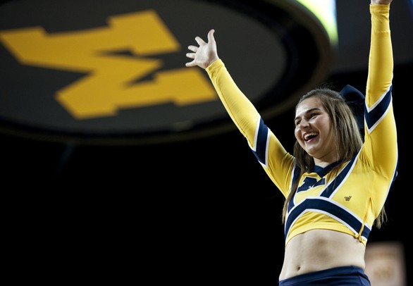 A Michigan cheerleader during a timeout on Tuesday. Daniel Brenner I AnnArbor.com /calendar/photologue/photos/_UM Defeats Western/cache/12042012_SPT_UM_Western_BBall_DJB_0651_fullsize.JPG