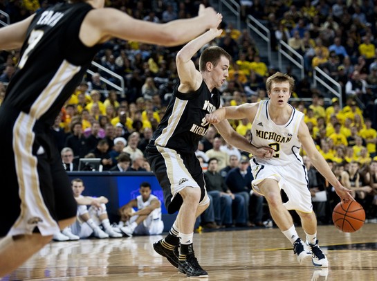 Michigan freshman Nik Stauskas goes toward the rim in the second half of the game against Western Michigan on Tuesday. Daniel Brenner I AnnArbor.com /calendar/photologue/photos/_UM Defeats Western/cache/12042012_SPT_UM_Western_BBall_DJB_0777_fullsize.JPG
