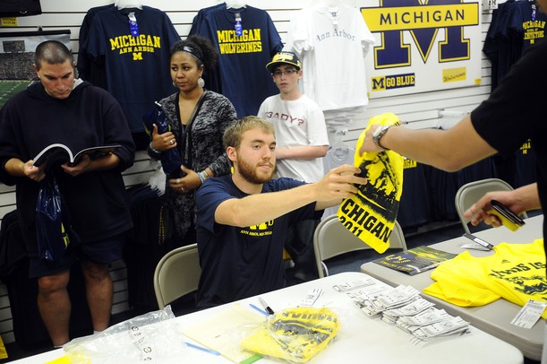 Michigan alumni Mike Dolsen hands a t-shirt to a student as Desmond Howard fans wait in line behind him for a chance to meet the football star during an autograph signing at the M Den on Friday. Melanie Maxwell I AnnArbor.com