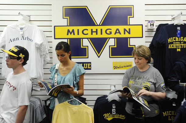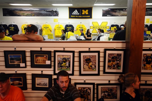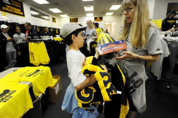 Michigan fan Corey Karp, of Tucson, AZ., shows his mom Iris, an item as they shop before an autograph signing with football star Desmond Howard at the M Den on Friday. Melanie Maxwell I AnnArbor.com