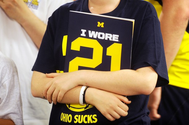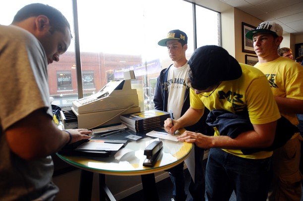 Michigan junior Takis Bletsis, Kokomo, Ind., Sophomore James Giardina, Rochester and Patrick Kosnik, Grand Rapids, purchase copies of Desmond Howard's new book ?I Wore 21: The Legend of Desmond Howard? before an autograph signing at the M Den on Friday. Melanie Maxwell I AnnArbor.com