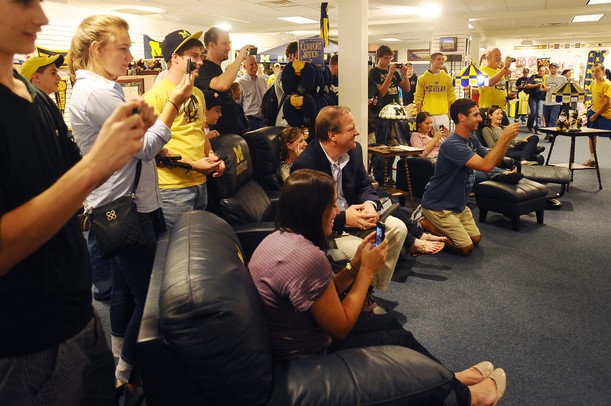 Fans take photographs as Michigan football star Desmond Howard takes his seat during an autograph signing at the M Den on Friday. Melanie Maxwell I AnnArbor.com