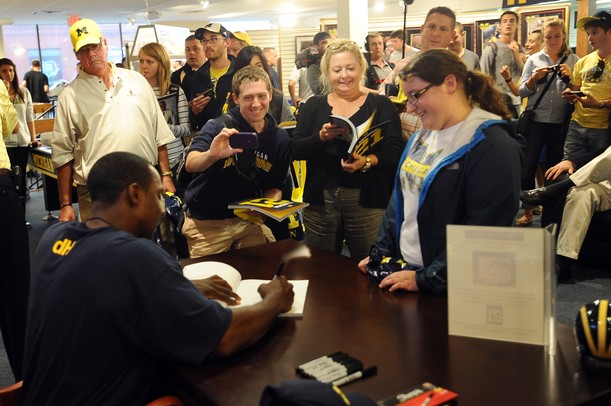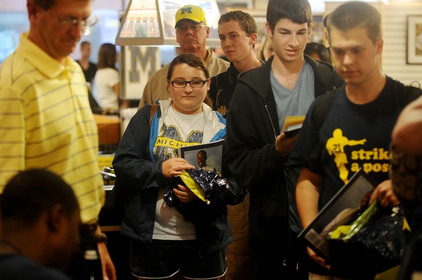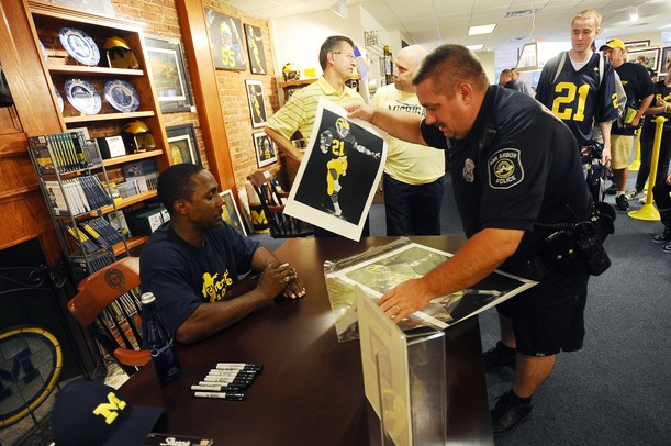 Fans lined up for former Michigan star Desmond Howard's autograph Friday evening at the M Den location at 303 South State Street in Ann Arbor. The Heisman Trophy winner, who will be honored during the Michigan-Notre Dame game on Saturday, signed copies of the new book by William Roose, "I Wore 21: The Legend of Desmond Howard."