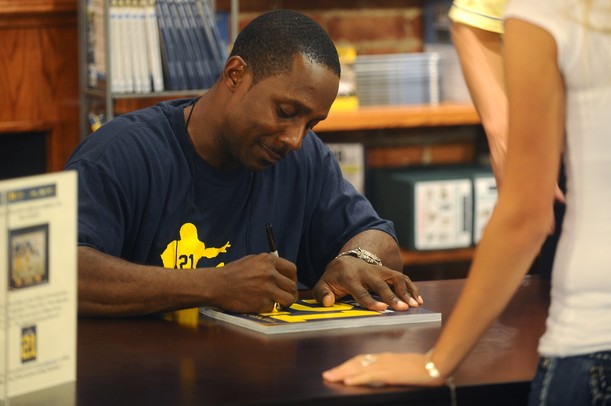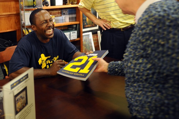 Michigan football star Desmond Howard signs a copy of his book ?I Wore 21: The Legend of Desmond Howard? during an autograph signing at the M Den on Friday. Melanie Maxwell I AnnArbor.com