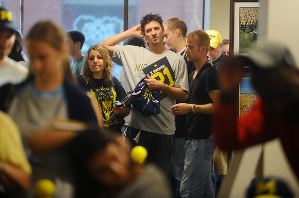 Fans wait in a line wrapped around the the second floor of the M Den in order to meet Michigan football star Desmond Howard during an autograph signing at the M Den on Friday. Melanie Maxwell I AnnArbor.com