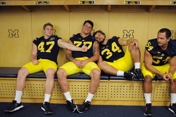 Michigan linebacker Jake Ryan, offensive linesman Taylor Lewan, kicker Brendan Gibbons and long snapper Jareth Glanda joke around as they hang out on a bench in the locker room during media day on Sunday, August 11, 2013. Melanie Maxwell | AnnArbor.com /calendar/photologue/photos/00 Media Day/cache/081113_SPT_MediaDay_MRM_22_fullsize.JPG