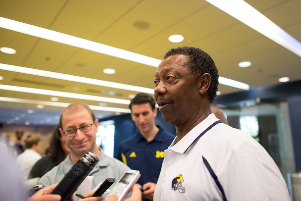 Michigan's new Outside Linebackers Coach Roy Manning talks to reporters during media day in the Junge Family Champions Center, Sunday, August, 11. Courtney Sacco AnnArbor.com /calendar/photologue/photos/_1_/cache/081013_UM_media_day_CS-14_fullsize.JPG