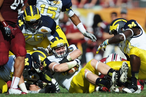 Michigan linebacker Jake Ryan recovers a fumbled South Carolina ball in the second quarter against South Carolina in the Outback Bowl in Tampa, Fla. on Tuesday, Jan. 1. Melanie Maxwell I AnnArbor.com /calendar/photologue/photos/00 First Half/cache/010113SPT_Outback_Bowl_MRM_13_fullsize.JPG