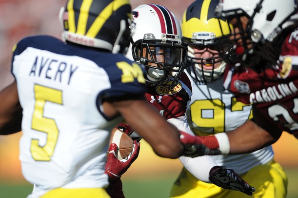 South Carolina cornerback Jimmy Legree slips past Michigan wide receiver Drew Dileo after intercepting a pass in the first quarter of the Outback Bowl at Raymond James Stadium in Tampa, Fla. on Tuesday, Jan. 1. Melanie Maxwell I AnnArbor.com /calendar/photologue/photos/00 Game/cache/010113SPT_Outback_Bowl_MRM_24_fullsize.JPG