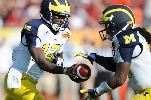 Michigan quarterback Devin Gardner hands the ball off to senior Denard Robinson in the third quarter of the Outback Bowl at Raymond James Stadium in Tampa, Fla. on Tuesday, Jan. 1. Melanie Maxwell I AnnArbor.com /calendar/photologue/photos/00 Game/cache/010113SPT_Outback_Bowl_MRM_42_fullsize.JPG