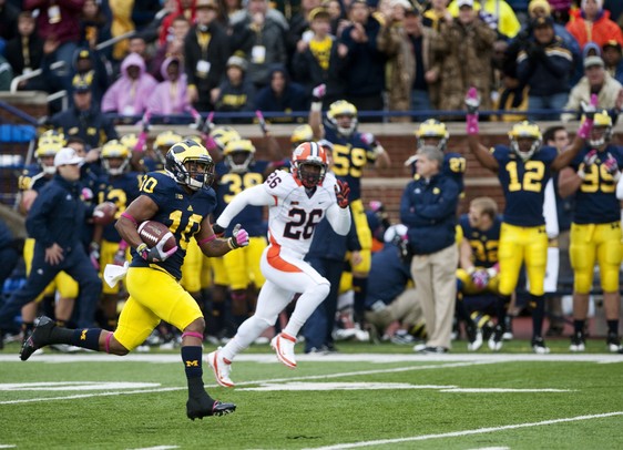Michigan running back Thomas Rawls celebrates after scoring a touchdown during a football game on Saturday morning in Ann Arbor. Michigan defeated Illinois 45 to 0. Joseph Tobianski | AnnArbor.com /calendar/photologue/photos/U of M v Ill Football JT Web/cache/10132012_SPT_UofMvIll_JT_17_fullsize.JPG
