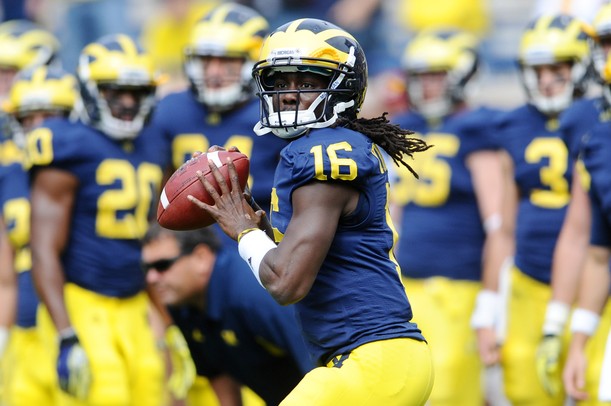 Michigan junior quarterback Denard Robinson looks to throw the ball during warm up before the start of their home game against Eastern Michigan at Michigan Stadium on Saturday. Melanie Maxwell I AnnArbor.com