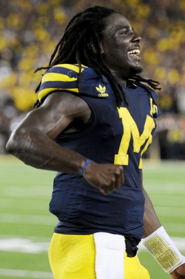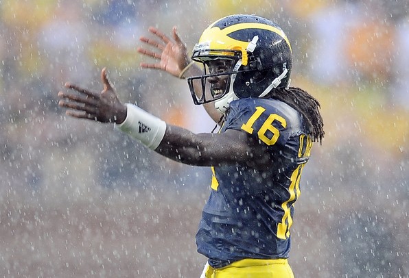 I think what everyone likes about Denard is that he's such a happy guy - and that photo of him pumping up the crowd in the rain shows that perfectly. I wish we could all have that kind of spirit. As a hobby photographer: I think he's one of those people who is easy to photograph: most photos of him are a pleasure to see. Photogenic? Yeah, and I think he's victory-genic too. Go Blue!