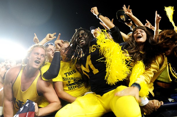 Michigan junior quarterback Denard Robinson celebrates in the stands with the fans after Michigan beat Notre Dame 35-31 during the first-ever night game at Michigan Stadium on Saturday. Melanie Maxwell I AnnArbor.com